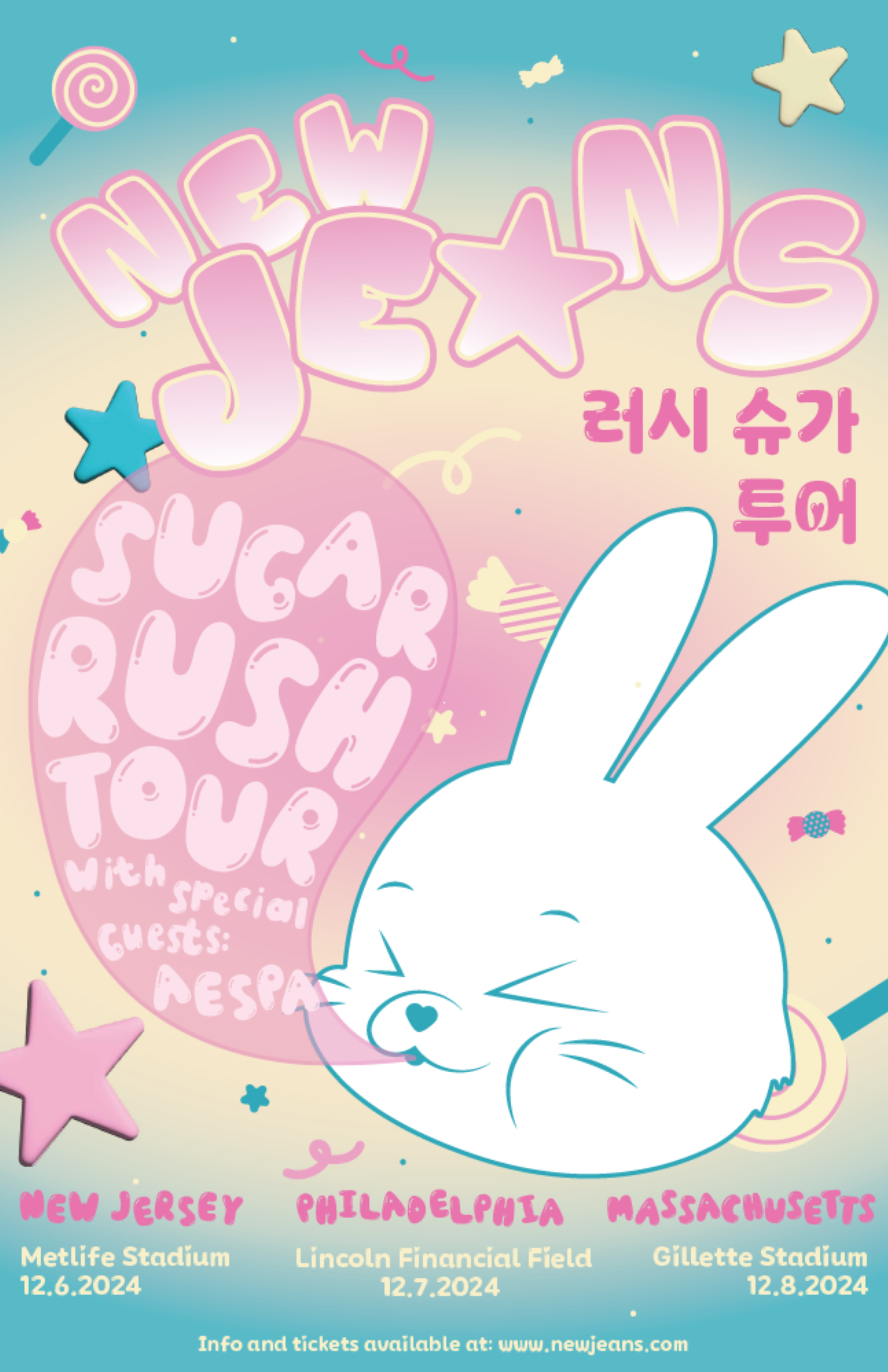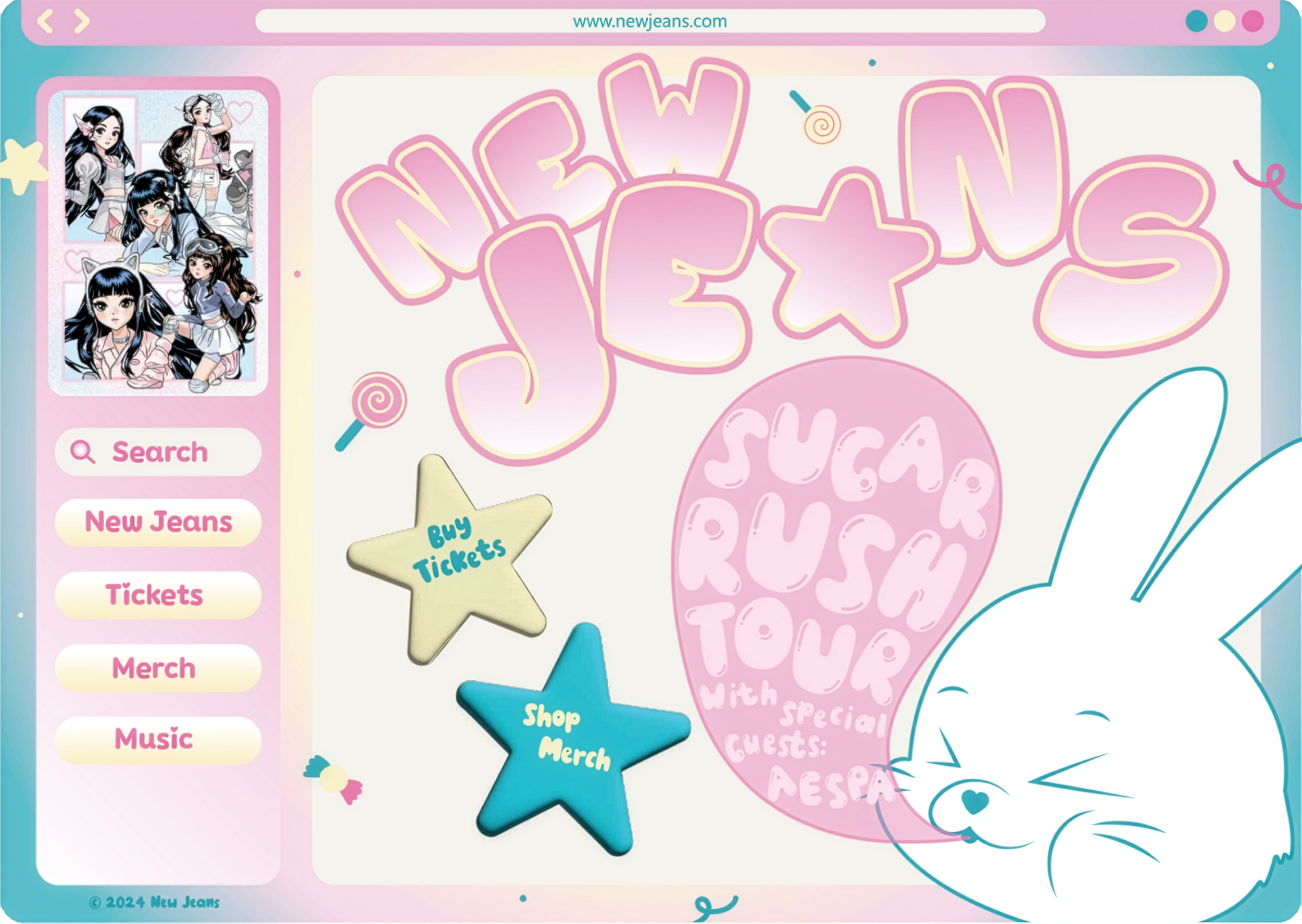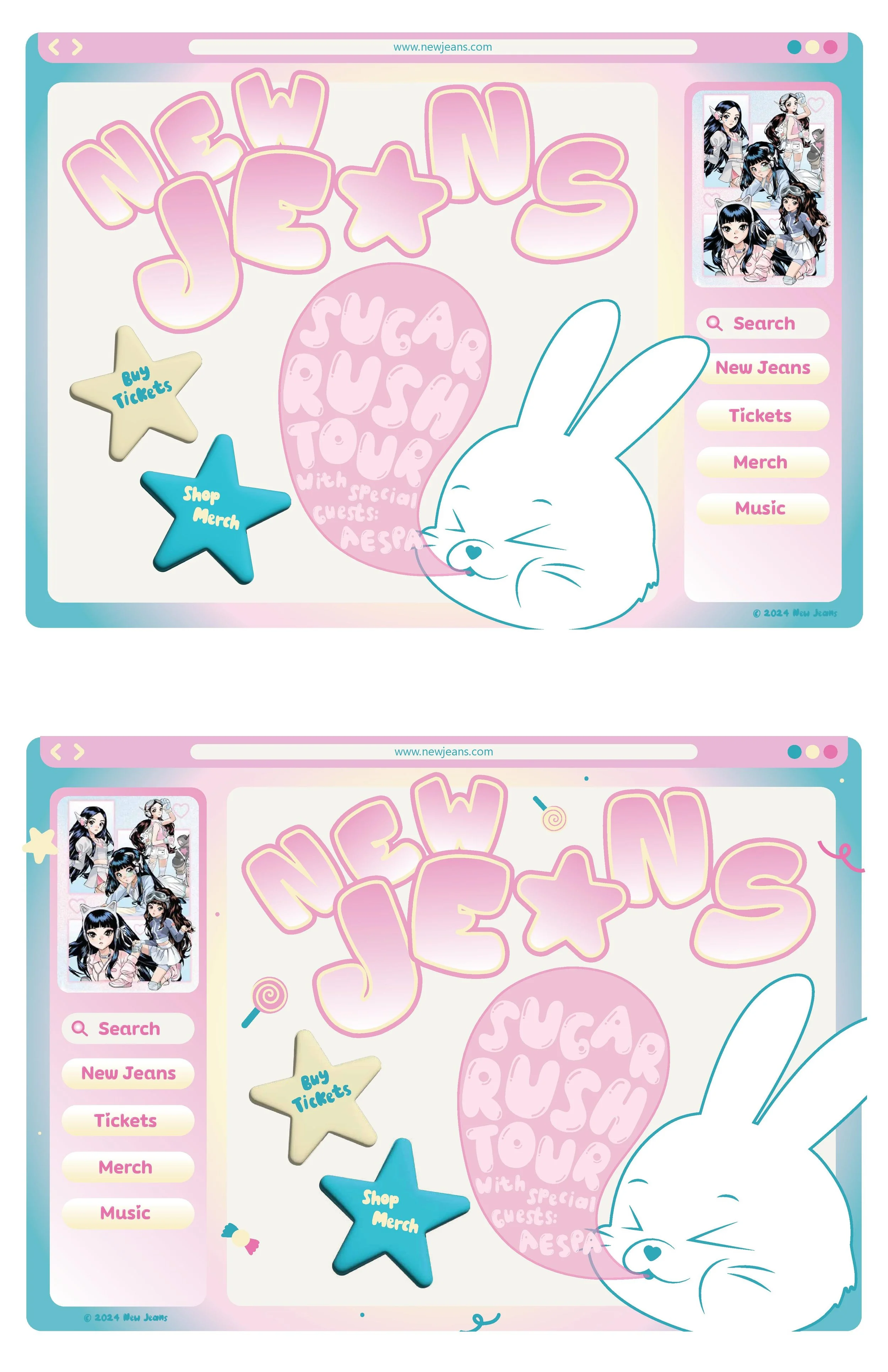 For this project, I was tasked with designing a mock tour promotion for a chosen artist, including a poster and website. I selected NewJeans, a popular K-pop group known for their youthful and playful energy. My goal was to capture their fun, dynamic identity while creating a cohesive tour theme. I developed clean layouts, bright visuals, and a modern aesthetic that balanced playfulness with simplicity. The final designs reflect NewJeans’ fresh brand and deliver an engaging, visually striking promotion for their tour.